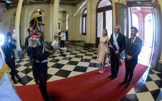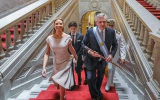 Estanislao, quien se hizo conocido por su actividad como cosplayer y drag queen, se mostró sonriente junto a su padre, con el bastón presidencial en la mano.