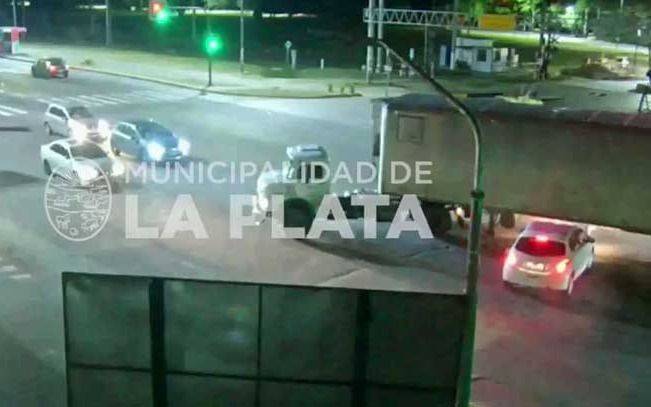 Según se puede observar en las cámaras de seguridad de la zona, el camión circulaba por Camino Centenario cuándo intentó doblar a pesar de tener la luz roja del semáforo para continuar su camino por 476, pero impactó a un vehículo marca Peugeot, color blanco, que perdió el control y terminó debajo del acoplado del vehículo de carga.