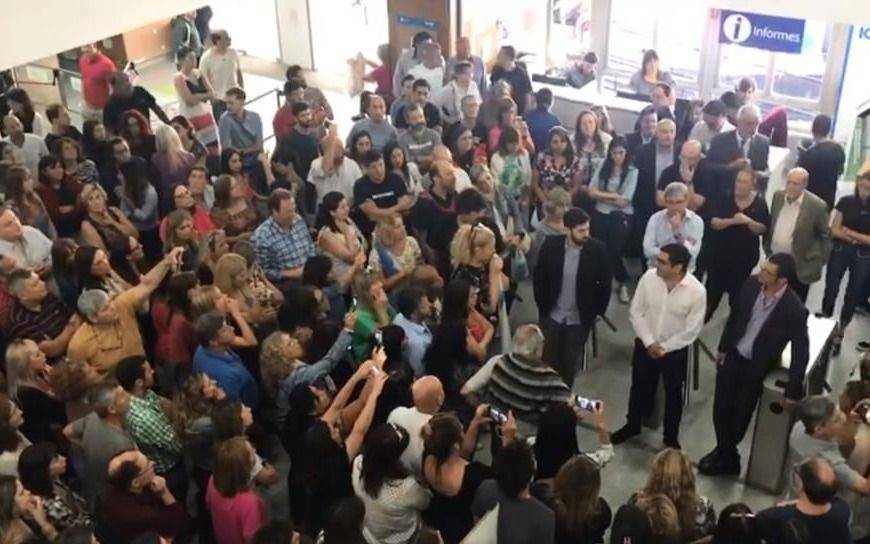Homero Giles brindó junto a los trabajadores y dio un discurso en tono político en el hall del edificio platense de la obra social provincial