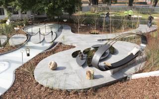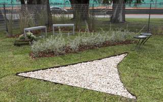 Se diseñó un espacio central de forma orgánica con piso de deck, que contiene los livings con el equipamiento, abrazado por el resto del espacio, todo cubierto de plantas. Alguno de los livings tienen techos resueltos con tela de camuflaje.