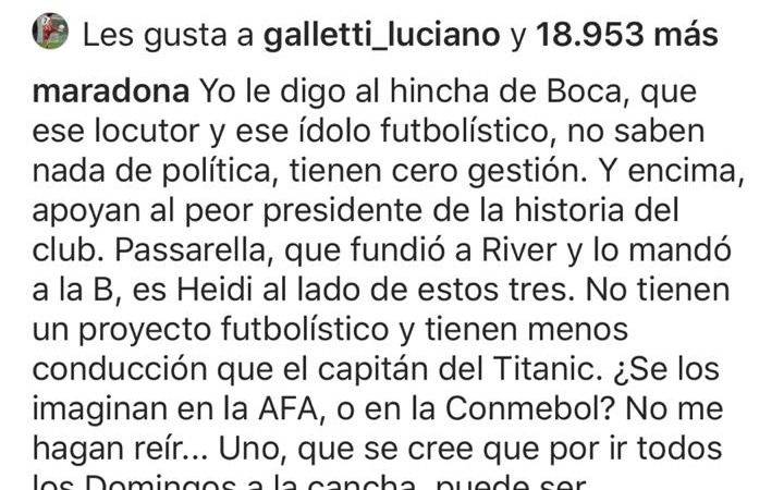 "Yo le digo al hincha de Boca que ese locutor y ese ídolo futbolístico no saben nada de política, tienen cero gestión. Y encima, apoyan al peor presidente de la historia del club. Passarella, que fundió a River y lo mandó a la B, es Heidi al lado de estos tres. No tienen un proyecto futbolístico y tienen menos conducción que el capitán del Titanic. ¿Se los imaginan en la AFA, o en la Conmebol? No me hagan reír...", escribió Maradona en su cuenta oficial de Instagram.