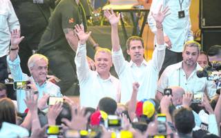 El mandatario interino disfrutó, junto a los presidentes de Colombia, Iván Duque; de Chile, Sebastián Piñera, y de Paraguay, Mario Abdo Benítez, así como con el secretario de la Organización de Estados Americanos (OEA), Luis Almagro, del cierre del espectáculo, a cargo del español Alejandro Sanz, del colombiano Juanes y de los venezolanos Chino y Nacho.