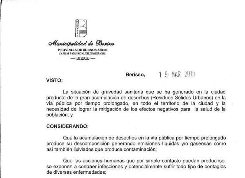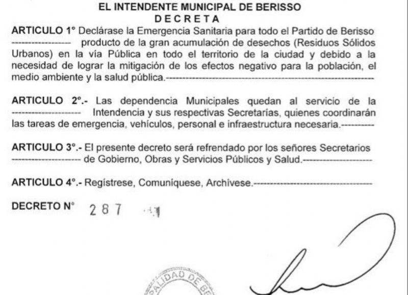 El Intendente de Berisso Jorge Nedela declaró la "Emergencia Sanitaria en el Casco Urbano del Partido de Berisso, producto de la gran acumulación de desechos (residuos sólidos urbanos) en la vía pública", mediante el Decreto N° 287 con fecha del 19 de marzo.