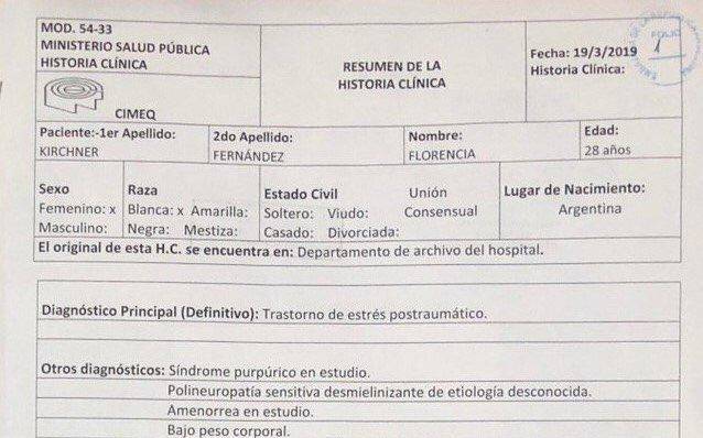 "Fue ella, en virtud de las mentiras y falsedades publicadas en estos días, quien me pidió que se conozcan públicamente", sostuvo Cristina Kirchner en el tuit en el que adjunta la historia clínica de Florencia.