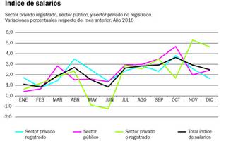 El primer trimestre de 2019 comenzó con salarios privados que van a seguir cayendo en términos anuales a tasas importantes, pero que contra el mes anterior le irán ganando a la inflación por las cláusulas de revisión de las paritarias que se están concretando en estos meses. Por lo que los salarios del sector privado deberían empatarle a la inflación en el primer trimestre.