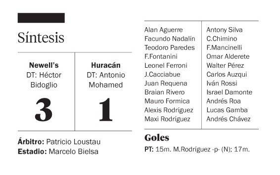 Los goles locales fueron convertidos por Maxi Rodríguez, de penal, y Alexis Rodríguez, en el primer tiempo, y por el portugués Luis Leal, en el complemento, mientras Andrés Chávez había empatado para Huracán.