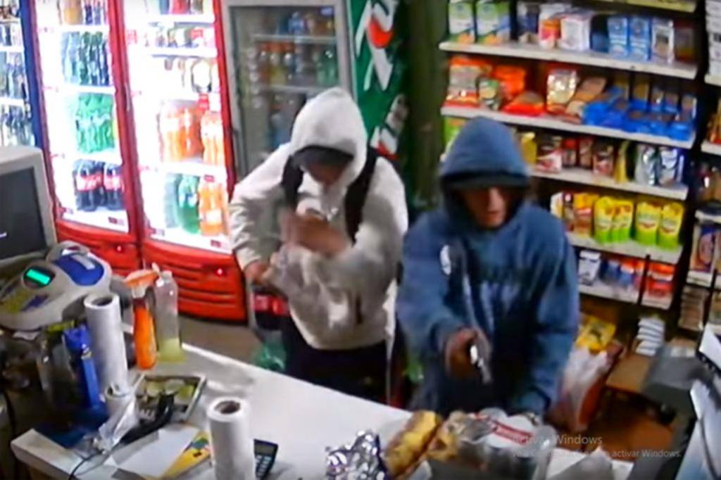 En las imágenes de la cámara se ve cómo se dividen los roles una vez que irrumpen en la escena. El de atrás, con el buzo blanco, parece llevar la batuta. A juzgar por los gestos, le indica a su amigo que controle hacia el fondo, mientras él manotea algo del mostrador. Era un cartón de cigarrillos.