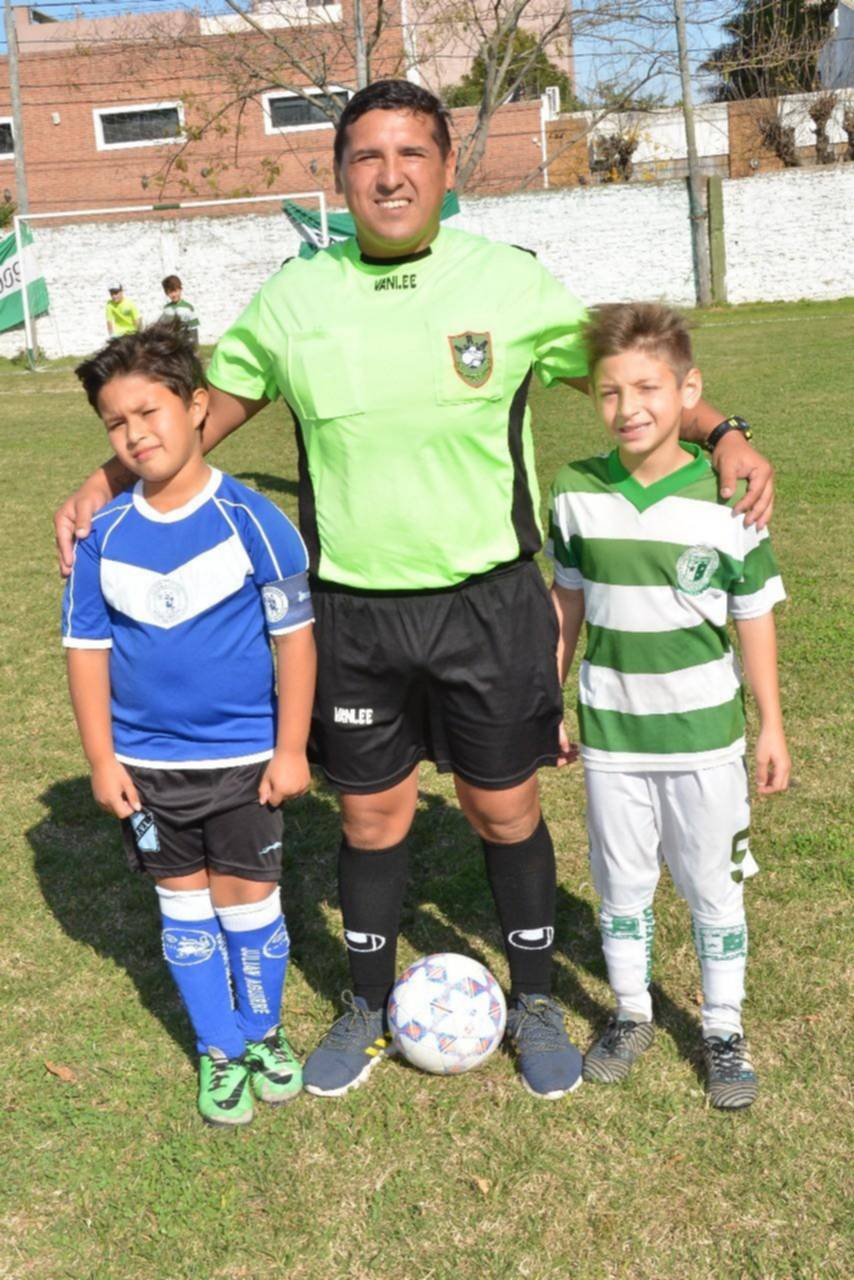 Jorge Solari, el árbitro de la jornada, posa para la foto con los capitanes de San Cayetano y Julián Aguirre.