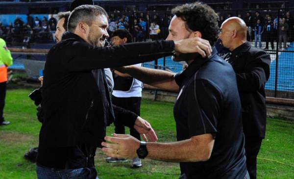 El abrazo de Milito y Coudet. El Chacho tuvo buena onda, los hinchas, todo lo contrario / Demian Alday