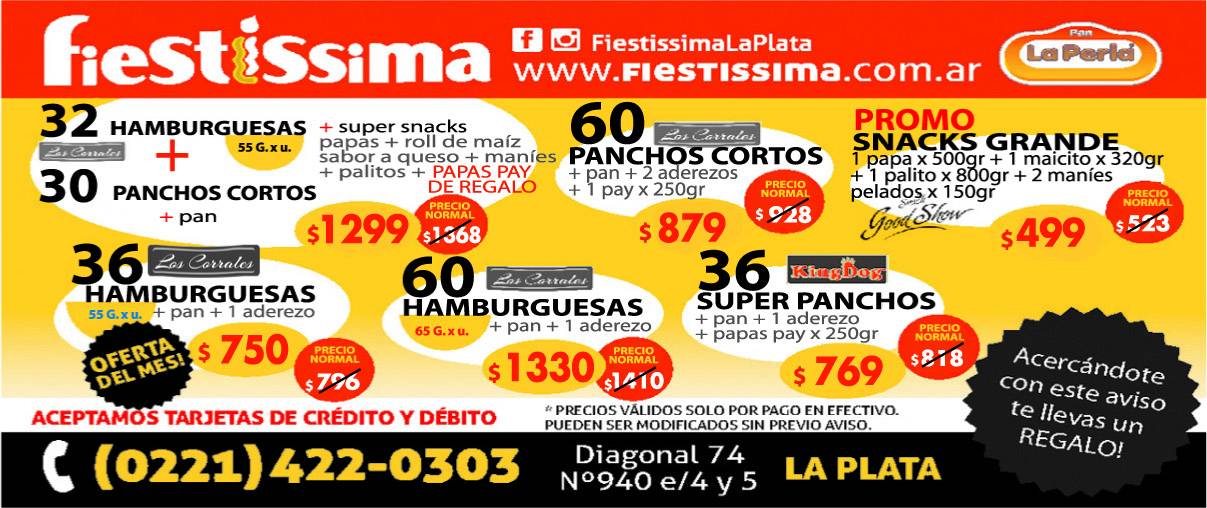 Fiestíssima también lanzó imperdibles rebajas para estar un paso al frente en el cuidado de la economía. Ya podés pasar por su local de diagonal 74, entre 42 y 43 Nº 940, y llevarte la excelente promo snacks grande que consiste en 1 paquete de papas fritas por 500 gs + 1 paquete de maicitos de 320 gs + 1 paquete de palitos por 800 gs + 2 paquetes de maníes pelados por 150 gs, todo a $499.