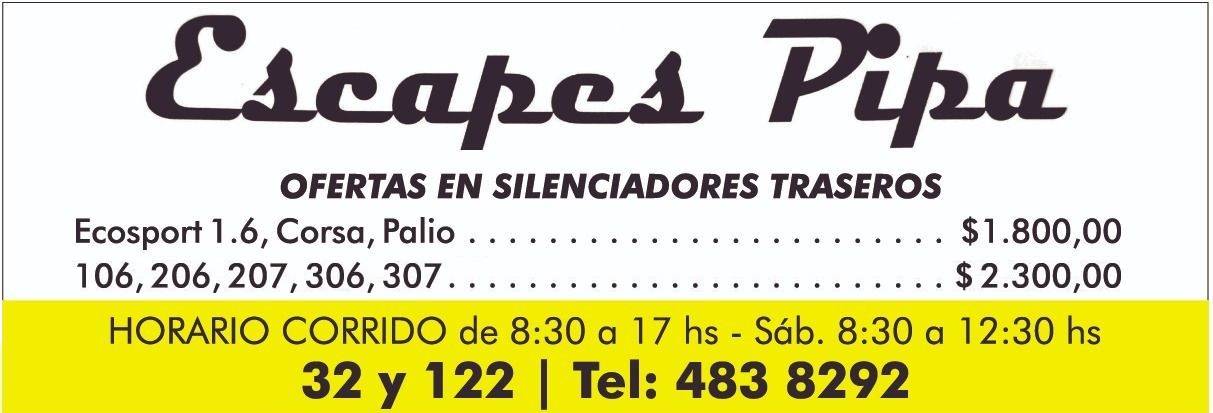 Escapes Pipa, ubicado en 32 y 122, te espera con inmejorables precios en caños de escape. Si estás buscando cambiar este repuesto de tu automóvil no dejes pasar la oportunidad. Quienes sean propietarios de una Ford Ecosport 1.6, un Corsa o un Palio podrán llevarse el caño de escape a $ 1.800,00 final. En tanto, quienes posean un Peugeot 106, 206, 207, 306 y 307 podrán renovar esta vía por $2.300,00.