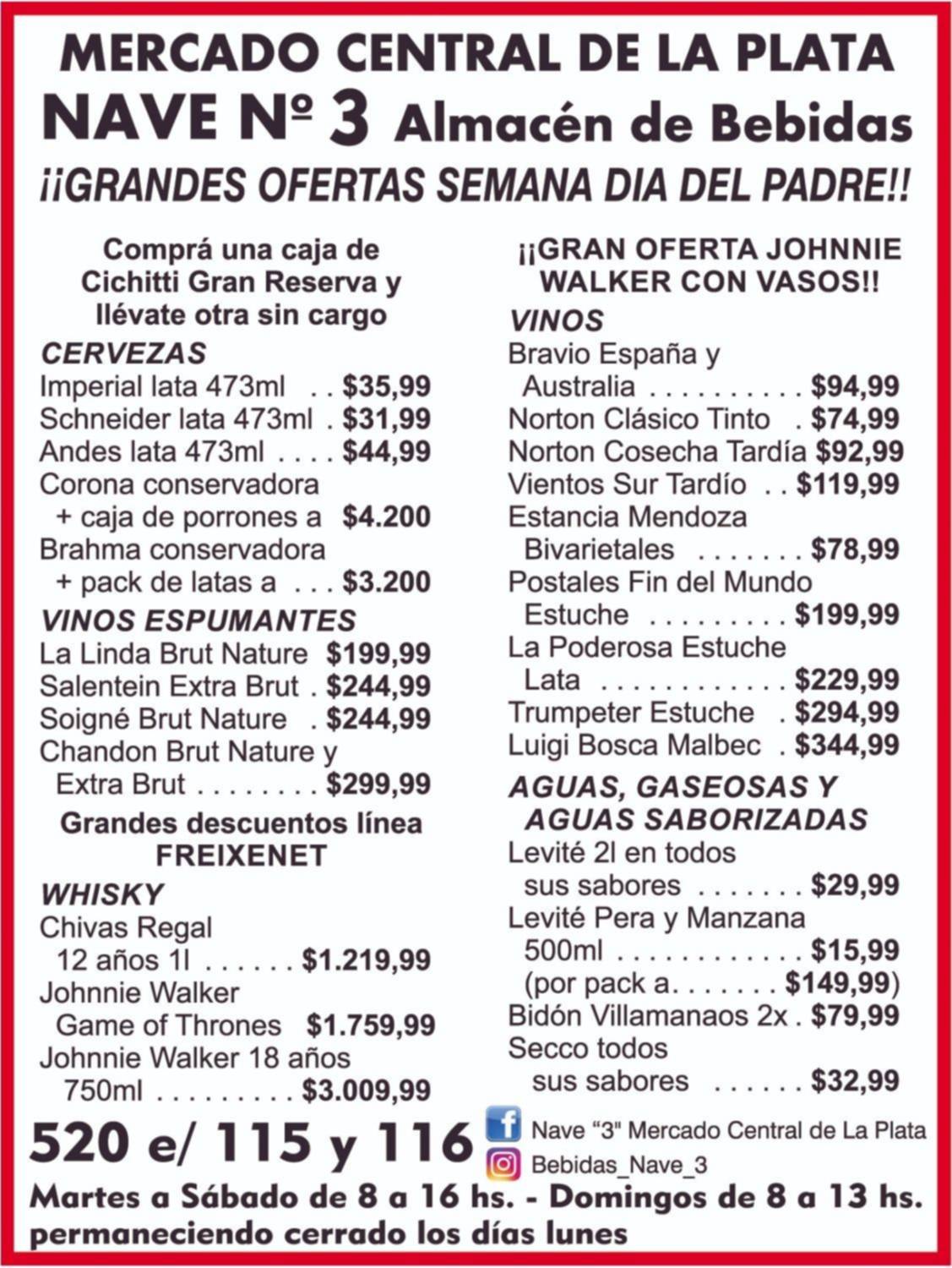 Nave Nº3 Almacén de Bebidas te espera en 520 entre 115 y 116, en el Mercado Central, con las mejores ofertas. Este fin de semana te espera con conservadora Corona + caja de porrones a $4.200 y vino Vravío España y Australia a $94,99. Visitá el espacio de martes a sábado de 8 a 16, y los domingos de 8 13 horas. Los lunes permanece cerrado.