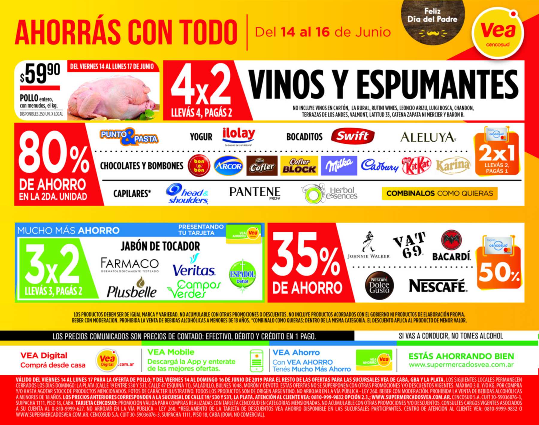 Del viernes 14 al domingo 16 de junio, Vea te espera con un 80 por ciento de descuento en la segunda unidad de igual marca y variedad de Bocaditos de marcas Swift, Aleluya, Yogurt Ilolay, Chocolates y Bombones de marcas Bon o Bon, Arcor, Milka, Karina, Cofler. Además, podrás aprovechar un 35% de ahorro en whiskys de marcas Johnny Walker y Vat 69 y cafe de marcas Dolce Gusto y Nescafé.
