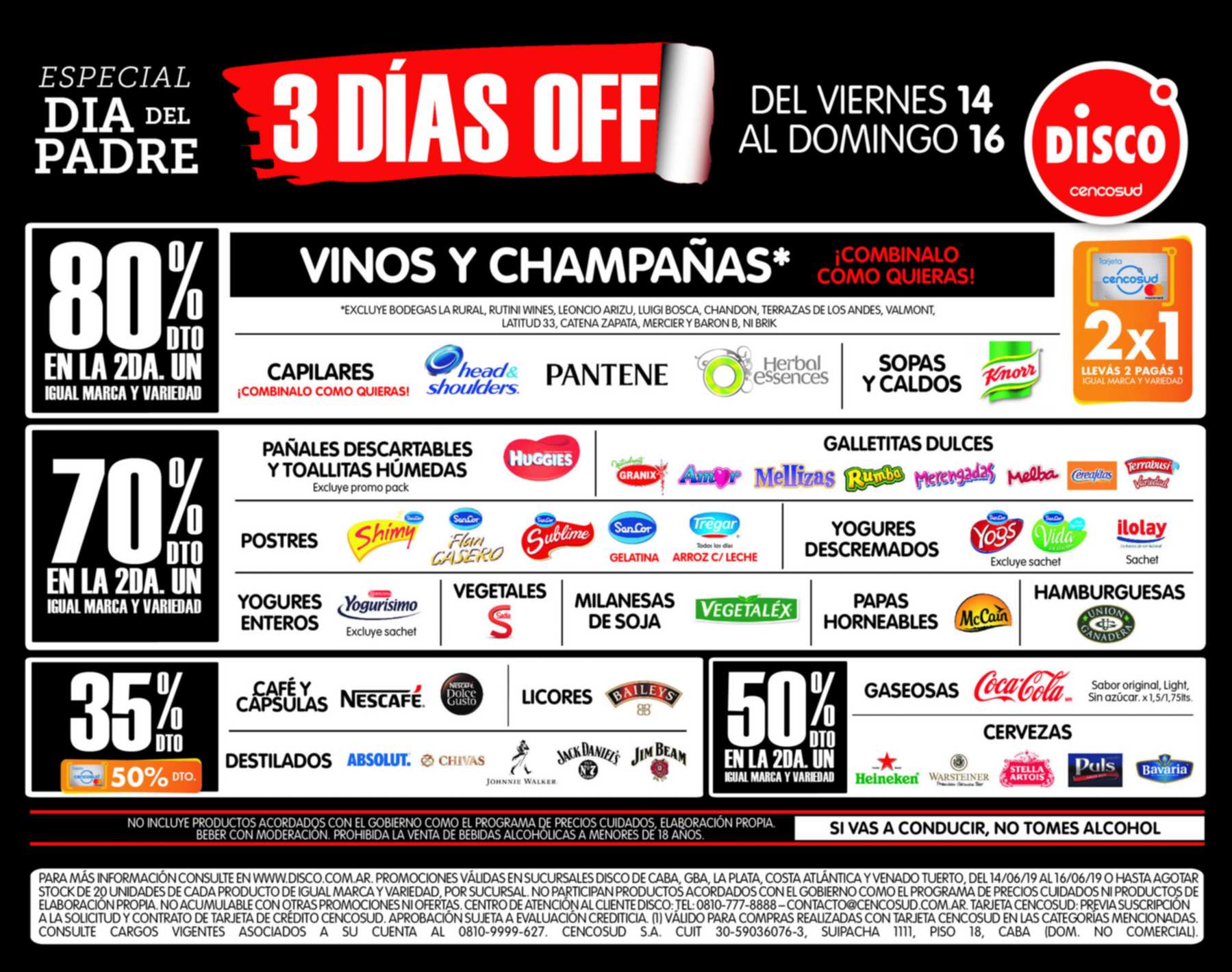 Como todas las semanas Disco publicó su menú de imperdibles ofertas aunque este viernes la lista salió recargada por el especial del Día del Padre. Se contemplan rebajas del 80% en la segunda unidad de productos seleccionados de igual marca y variedad de sopas y caldos Knorr; capilares de marcas Pantene, Head & Shoulders y un 50% de descuento en la segunda unidad de gaseosas de marcas Coca-cola y en cervezas de marcas Stella Artois, Puls y Bavaria.