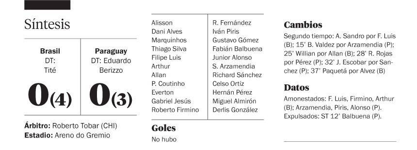 Brasil tuvo que esperar hasta la medianoche para conseguir el boleto a las semifinales de la Copa América. Derrotó 4-3 a Paraguay en definición por penales, luego de empatar 0-0 en tiempo reglamentario. De esta manera espera por Argentina o Venezuela el próximo martes en Belo Horizonte. De paso, rompió la mala racha que lo perseguía ante este rival, que lo había eliminado de las copas 2011 y 2015, ambas por penales.