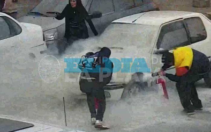 En ese marco, el automóvil marca Peugeot, modelo 106 de color blanco, comienza a ser apagado con matafuegos por parte de los automovilistas y acto seguido se acercan al lugar dos cuadrillas de la superintendencia de seguridad siniestral y de bomberos, quienes sofocan el incendio.
