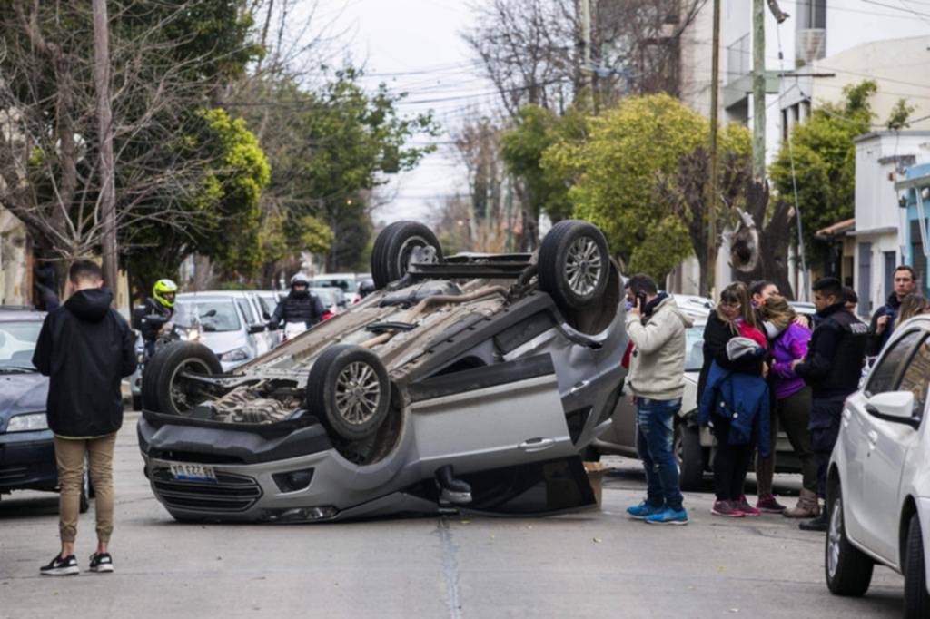 Un hombre demorado en la comisaría Segunda, una mujer trasladada al hospital Gutiérrez y una camioneta dada vuelta fue el saldo de un fuerte choque que ocurrió ayer a la tarde en 12 y 34. La víctima, que sufrió golpes, iba como acompañante en la EcoSport que terminó volcada, en tanto que el aprehendido es el conductor del otro rodado involucrado, de la marca Renault, quien “se puso agresivo con policías y médicos” en la escena, se informó oficialmente.