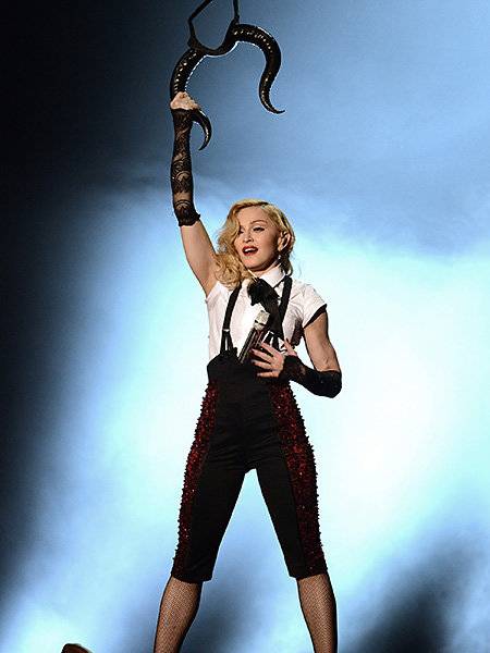 Madonna ocupó el centro del escenario en el show de medio tiempo del Super Bowl 2012, vistiendo Givenchy Haute Couture de Riccardo Tisci, rematada por una brillante corona de Cleopatra (5 de febrero de 2012)