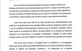 En su misiva, Dujovne señaló que renunció convencido de que, en virtud de las circunstancias, la gestión que lidera Macri “necesita una renovación significativa en el área económica”.