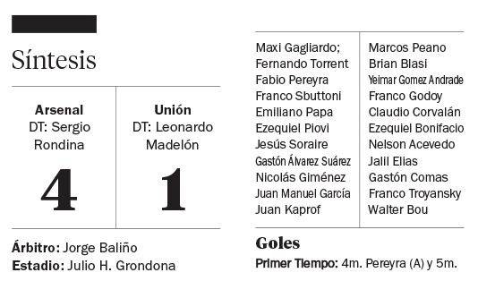 Arsenal vapuleó a Unión con una tremenda goleada por 4 a 1, en el Viaducto. En el primer tiempo marcaron para el vencedor Fabio Pereyra y Nicolás Giménez, y en el segundo Juan Kaprof y Joel Soñora, descontando para la visita Walter Bou.