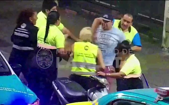 Al observar la situación, agentes del Centro de Operaciones y Monitoreo (COM) dieron aviso a la Policía Local. Mientras tanto, el motociclista intentó subirse nuevamente a la moto, pero al no conseguirlo la pateó y agredió físicamente a personal de tránsito hasta que lograron reducirlo con ayuda de la policía, que ya se había hecho presente en el lugar de los hechos.