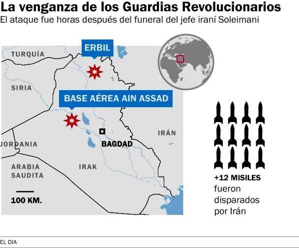 Irán lanzó anoche “decenas” de misiles tierra-tierra hacia una base aérea de Irak en la que hay tropas estadounidenses, en represalia por el asesinato del alto general iraní Qassem Soleimani a manos del gobierno de Donald Trump.