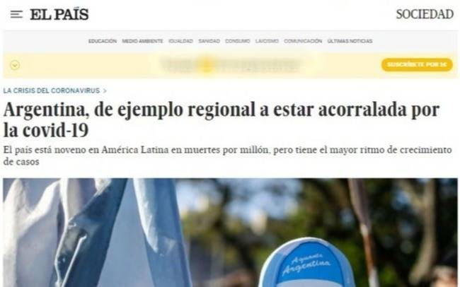Según el editorial del diario español, “Argentina pudo contener el avance del coronavirus en los primeros meses, en detrimento a lo que sucedía en Europa, Estados Unidos y en los países más cercanos como Brasil, Chile y Perú, por ejemplo”. Pero “todo cambió: la economía se fue deteriorando tanto que comenzó la flexibilización y hoy el país tiene el quinto número más alto de contagios del planeta y se acerca a los más castigados en muertes. Encima, en muchas regiones el sistema de salud se vio saturado”.