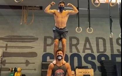 El que quedó con los pies sobre el suelo inició el desafío y luego le pasó a la barra al que estaba parado sobre sus hombros. Realizaron dos repeticiones y todo salió a la perfección. Antes de bajarse, el deportista que estaba arriba, le puso la frutilla al postre haciendo equilibrio sobre la cabeza de su compañero.