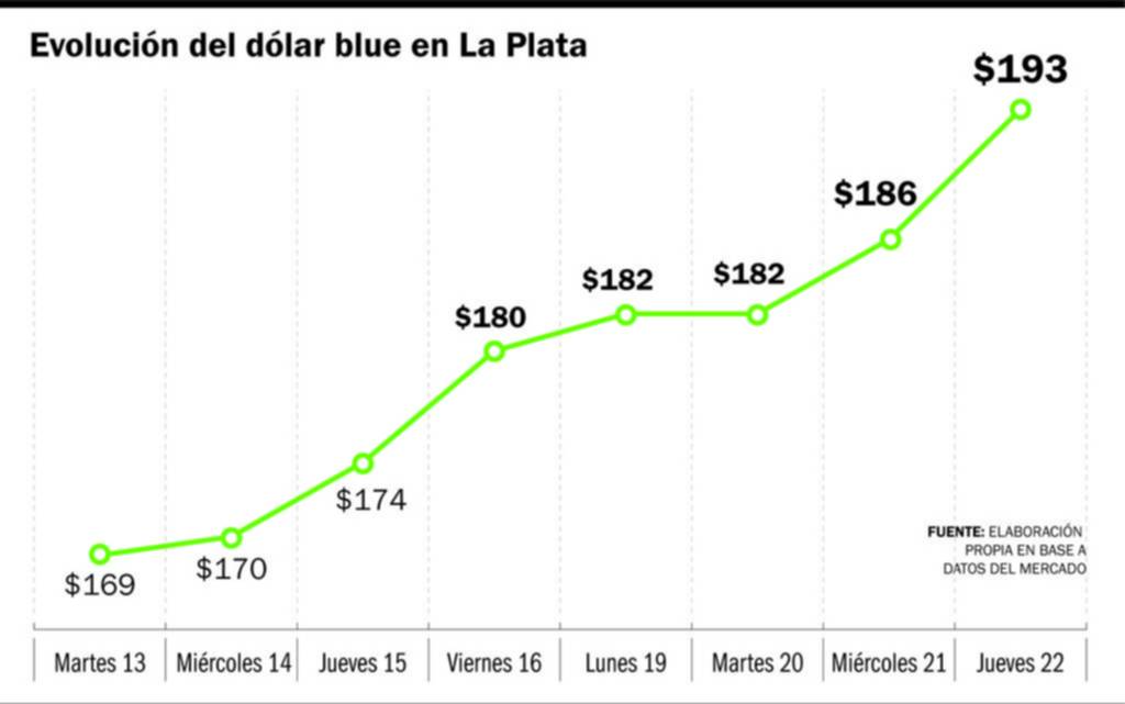 En una jornada frenética, el dólar blue trepó otros 6 pesos en la Región y cerró en $193, en un mercado con pocas operaciones, que se cerraban “a teléfono abierto”. Esto era porque al cambiar tanto la cotización solo se confirmaban los precios cuando se intercambiaban los billetes y no antes.