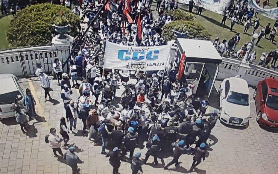 Los incidentes se registraron este mediodía en las puertas del playón de calle 11 entre 51 y 53, cuando un sector de los manifestantes buscaron ingresar con palos y armas caseras al Palacio de gobierno. En el lugar se toparon con los agentes de la secretaría de Seguridad comunal y de la Policía Local, quienes forcejearon y terminaron con escenas de violencia sobre el estacionamiento.