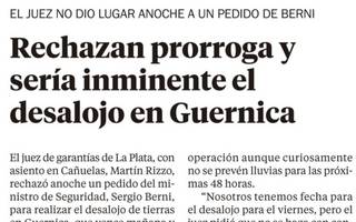 Sergio Berni apeló a una vieja táctica militar tendiente a desorientar al “enemigo”. Amagó por un lado y apareció por el otro. Tanteó el teatro de operaciones y cayó en la cuenta de que, más allá de la intimación legal que apremiaba al gobierno bonaerense, se imponía sin más demora concretar el desalojo en los terrenos tomados de Guernica.