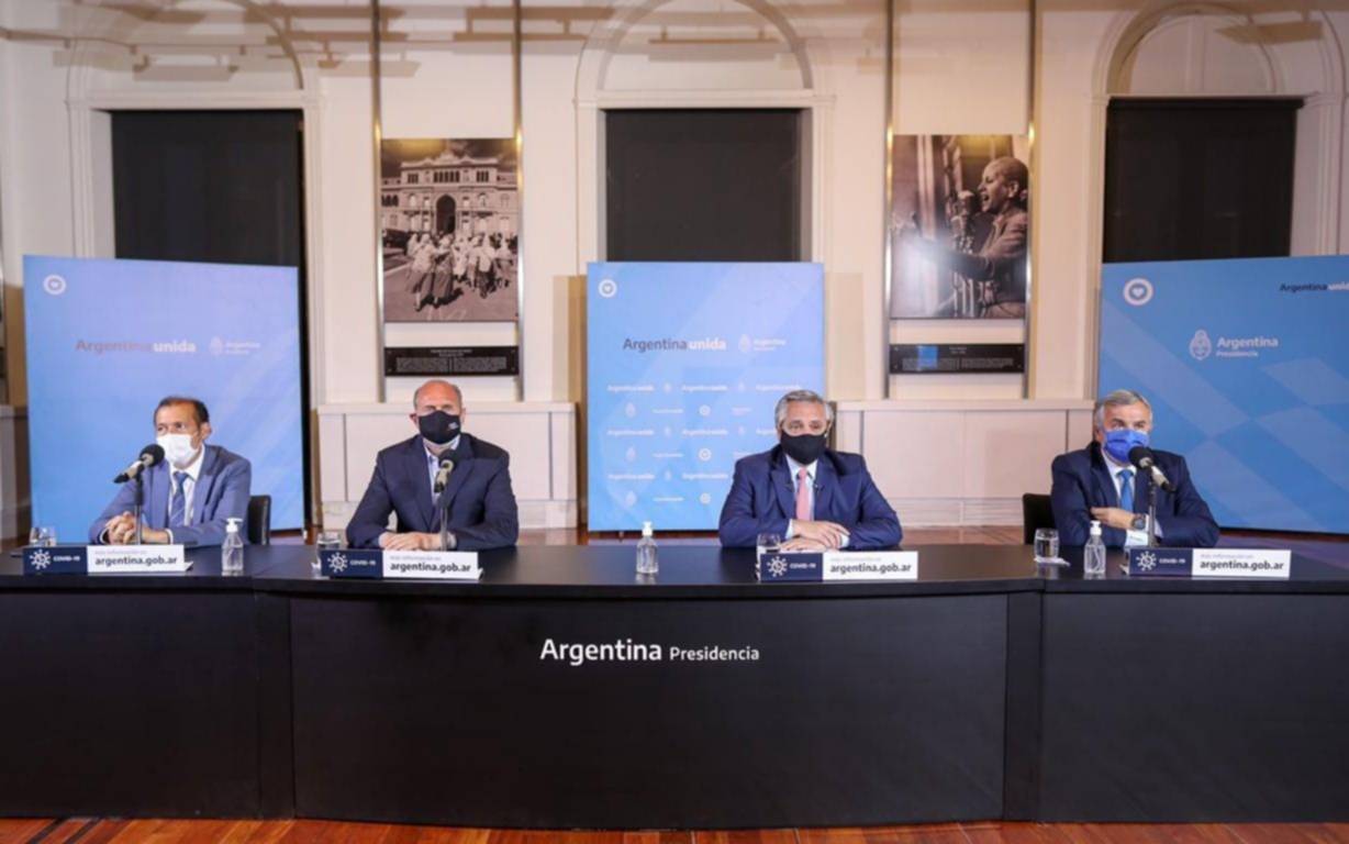 El anuncio se concretó tras una reunión que el jefe de Estado mantuvo esta tarde con el gobernador de la provincia de Buenos Aires, Axel Kicillof, quien participó por videoconferencia porque permanece aislado por ser contacto estrecho de un caso de Covid-19;, y con el jefe de Gobierno porteño, Horacio Rodríguez Larreta, quien concurrió a la Casa de Gobierno junto al vicejefe, Diego Santilli.