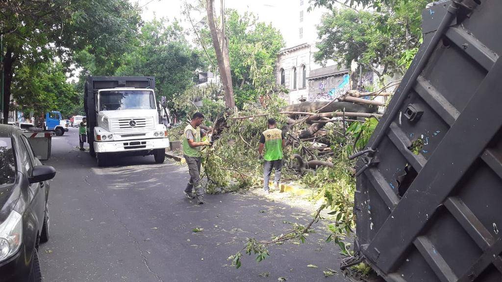 El trabajo de remoción del árbol consistió en trozar lo caído; eliminar las ramas peligrosas y descopar el Ombú; como así también las tareas necesarias para la futura extracción y evitar posibles accidentes.