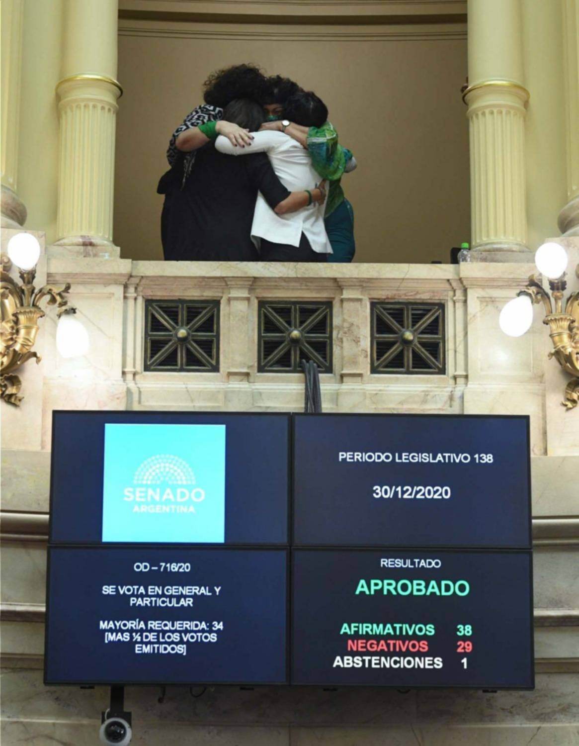 El "si" a la legalización del aborto (mediante el proyecto de Interrupción Voluntaria del Embarazo) hasta la semana 14 de gestación se impuso por 38 votos afirmativos y 29 negativos y una abstención, tras un acuerdo alcanzado con algunos senadores indefinidos para retoques en el texto al momento de la promulgación, en una sesión que comenzó el martes y se extendió durante 12 horas.