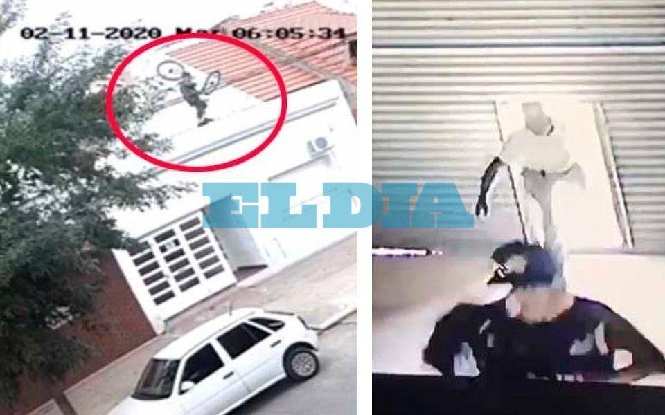 En otro punto de La Plata, precisamente en 42 entre 17 y 18 del barrio La Loma, otro malviviente quedó filmado mientras huía con una bicicleta robada de una vivienda. Para escapar cargó el rodado al hombro, subió hasta el techo los techos y saltó por la pared para dar con la vereda. Huyó caminando.