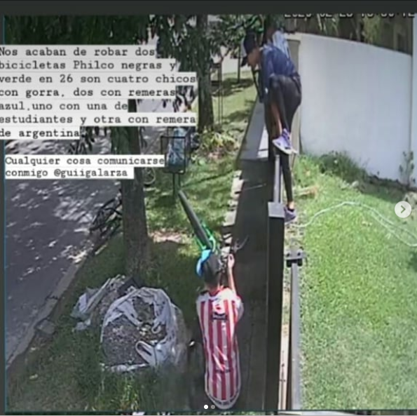"Nos acaban de robar dos bicicletas Philco negras y verde en 26. Son cuatro chicos con gorra, 2 con remera azul, 1 con una de Estudiantes y otro con remera de Argentina" señala la misma usuaria en una foto que publica sobre el momento del pasamanos.