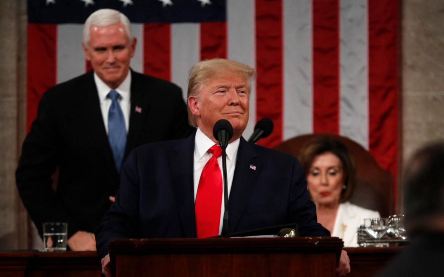 Atrás de él y al lado del vicepresidente Mike Pence, estuvo sentada la dirigente que encabezó el proceso en su contra, la presidenta de la Cámara de Representantes, la demócrata Nancy Pelosi. La última vez que se reunieron para hablar, en octubre pasado, el encuentro terminó con gritos y un portazo de la líder opositora.