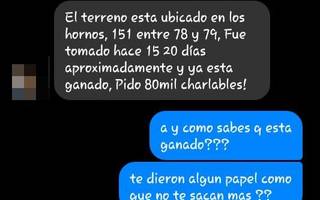 En ese marco, ayer aparecieron nuevas capturas de pantalla en las que se da cuenta del ofrecimiento clandestino de las tierras que fueron copadas por intrusos hace ya 21 días. Por caso, por un terreno en 151 entre 78 y 79 un usuario admitía que “fue tomado hace 15, 20 días y ya está ganado, pido $80.000 charlables!” (ver aparte).