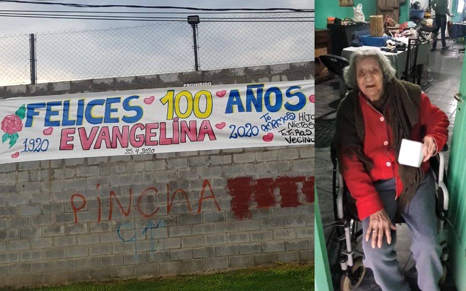 Como no pudo festejar (“seguro que muchos me van a saludar por teléfono”, había anticipado), la familia mandó a confeccionar un pasacalles que se montó frente a su casa y que le desea “Felices 100 años Evangelina”.