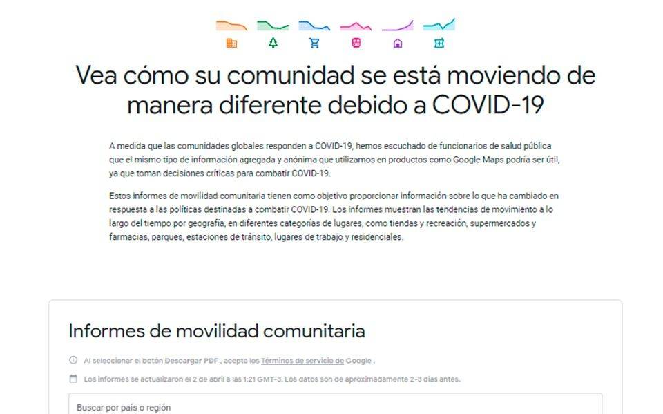 Estos datos, descargables en una web accesible para 131 países, revelarán las "tendencias generales de los movimientos en el tiempo y por zona geográfica, en diferentes categorías de sitios, como lugares de ocio, comercios de alimentación, farmacias, parques, estaciones de transportes en común, centros de trabajo y residencias", según un artículo publicado en un blog de la compañía.
