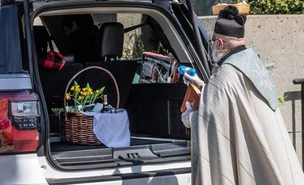“Adaptándose a la necesidad de distanciamiento social, la parroquia de San Ambrosio continuó con su tradición de bendición de canastas de comida de Pascua, al estilo de autoservicio”, indicó la parroquia en su página de Facebook.
