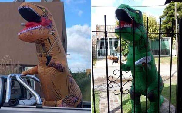 “Si quieren, que denuncien a un dinosaurio”, planteó el vecino de Lomas de City Bell ya enfundado en el traje del típico reptil prehistórico y salió a caminar por los espacios comunes del barrio cerrado. Su insólita presencia en las calles internas de la urbanización provocó tal revuelo en el vecindario que ahora está obligado a salir a diario. “Saludo a los chicos, que sólo pueden hacerlo desde la puerta de sus casas, sin acercarse”, contó.