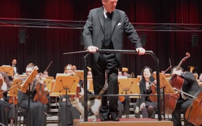 Un felino se paseó plácidamente por un escenario de Estambul, donde una orquesta proyectaba un concierto de música clásica.