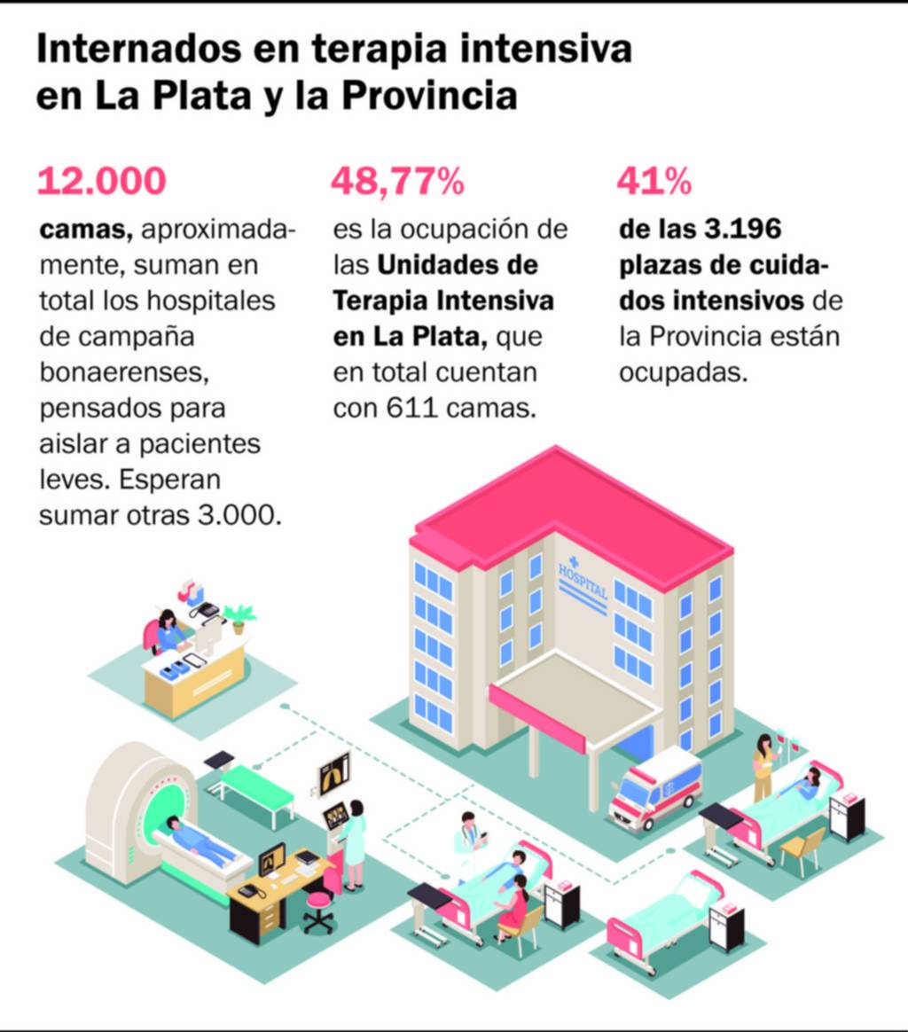 En La Plata, casi la mitad de las 611 camas dispuestas para cuidados intensivos están ocupadas, por encima de la media provincial, que se ubica en un 41 por ciento de ocupación. Y aunque en el gobierno bonaerense aseguraron que la situación, por ahora, “está controlada”, ya comenzaron a aceitarse los engranajes para un eventual traslado de infectados leves por coronavirus a centros de aislamiento como los montados en la República de los Niños, el Polideportivo de los Hornos, la sede de Gimnasia y el estadio de Estudiantes.