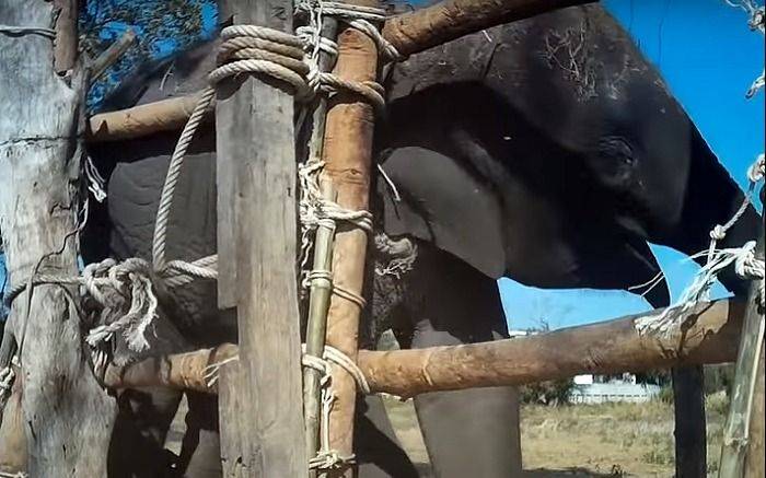 Separado de su madre, sometido a un fuerte estrés, es encerrado en un recinto muy estrecho, atado con cuerdas y cadenas, según estas imágenes filmadas el año pasado con una cámara oculta en Tailandia, y publicadas el miércoles por el grupo británico de defensa de los animales World Animal Protection (WAP).