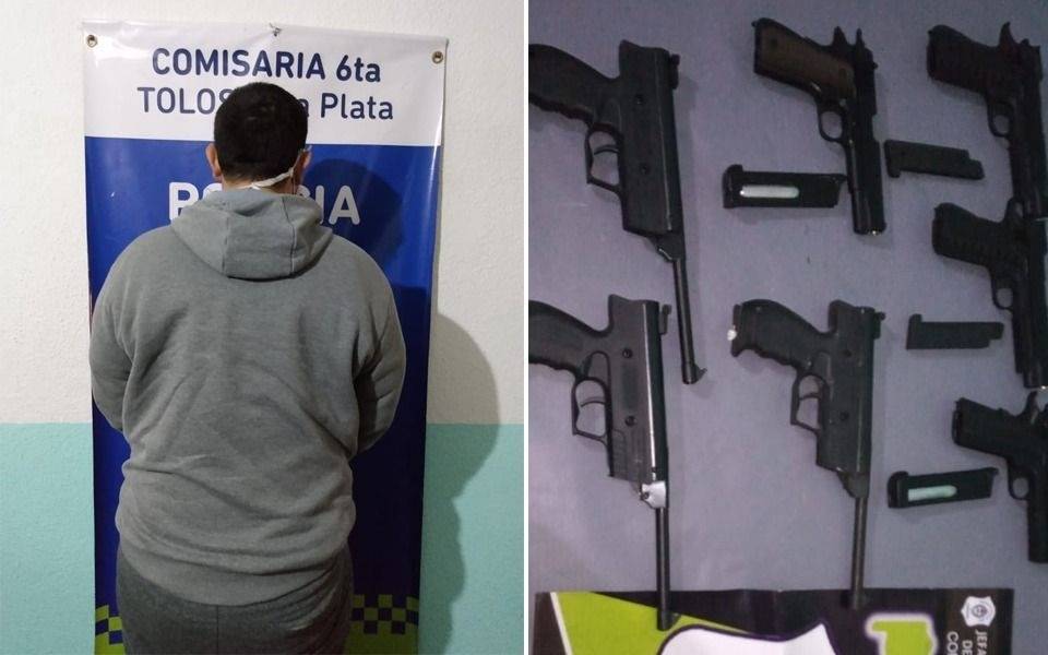 Los efectivos de la comisaría sexta registraron la casa del joven en el marco de una causa por amenazas agravadas y hallaron una pistola réplica colt 45, una pistola réplica marca IMF, una pistola réplica OPS Tactical 45 y tres pistolas de aire comprimido marca Súper Air Pistol 5.5.