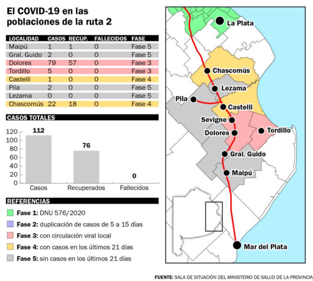 En Dolores, un brote en las últimas semanas hizo que se volviera de la etapa cinco a la tres. Chascomús retrocedió una etapa tras una serie de casos después de haber alcanzado, por un fin de semana, una fase con restaurantes y reuniones de hasta 10 personas habilitadas. Primeros contagios en Castelli y Tordillo