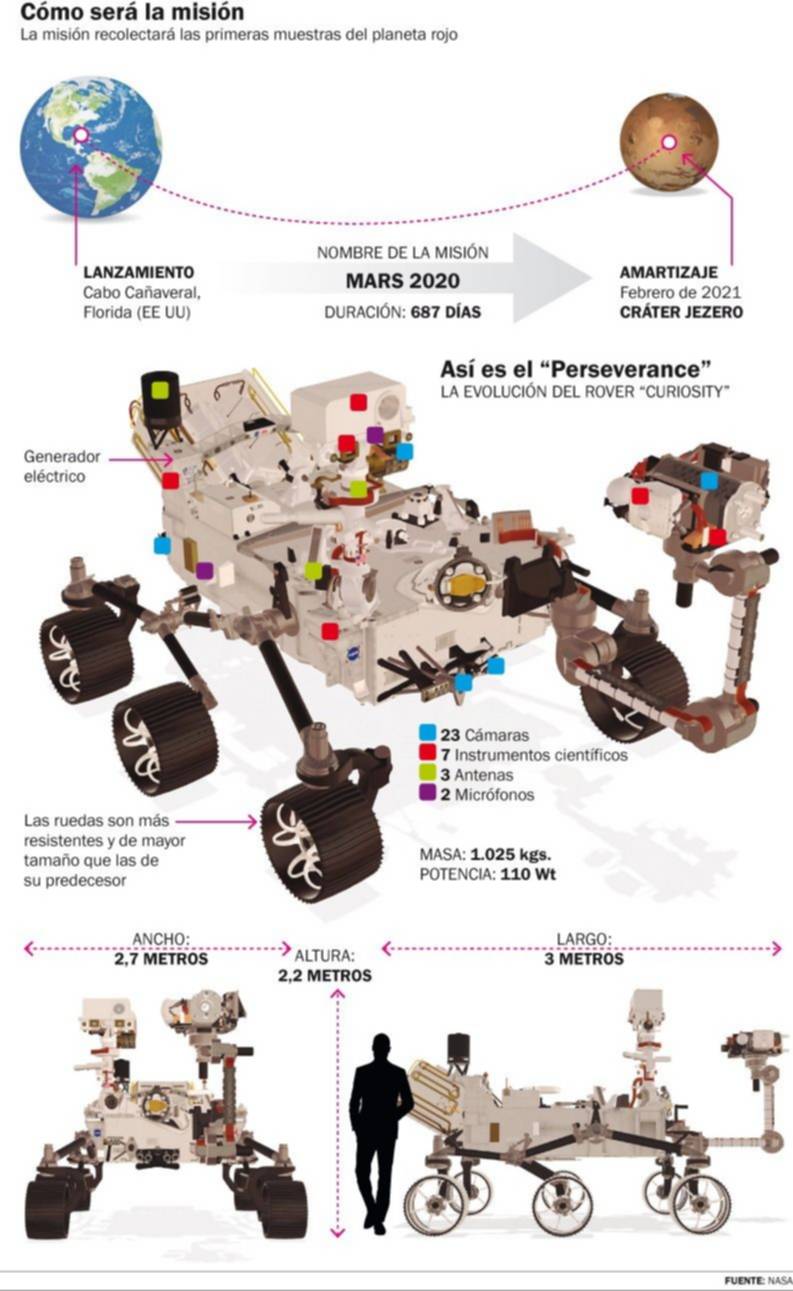 Tiene la misión de buscar rastros de vida antigua y de explorar el planeta. Fue lanzado ayer y viajará más de siete meses