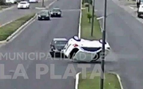 Un herido fue el saldo de un choque y vuelco en Villa Elisa que quedó registrado por las cámaras de seguridad de la Municipalidad de La Plata.