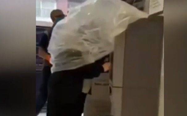 La mujer se puso una enorme bolsa que la cubría hasta las piernas, seguramente para reducir las posibilidades de exponerse a un eventual contagio de coronavirus. Pero el traje elegido no era muy práctico al momento de utilizar el cajero automático y al final en la imagen captada con un teléfono celular se la ve teniendo que sacar las manos para operar las teclas, mientras las personas que presenciaban la escena no salían de su asombro ante lo que veían.